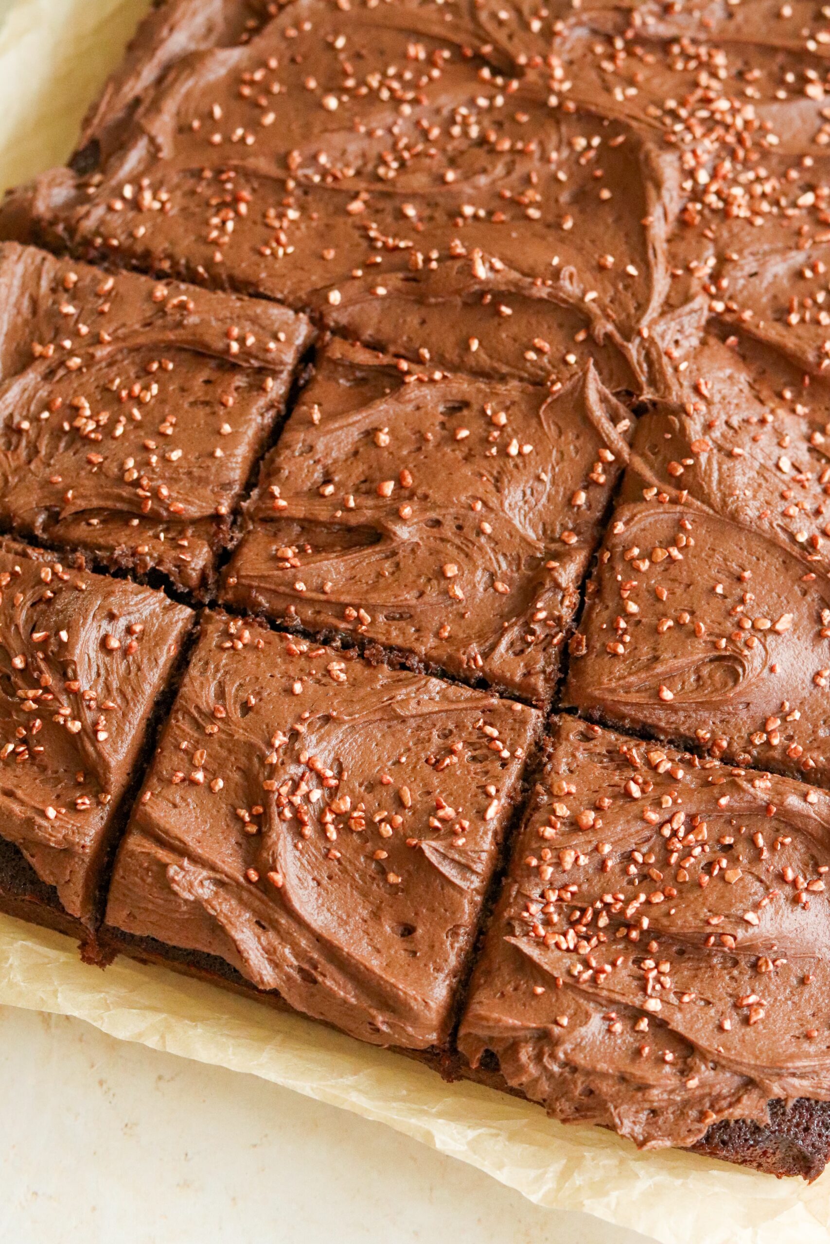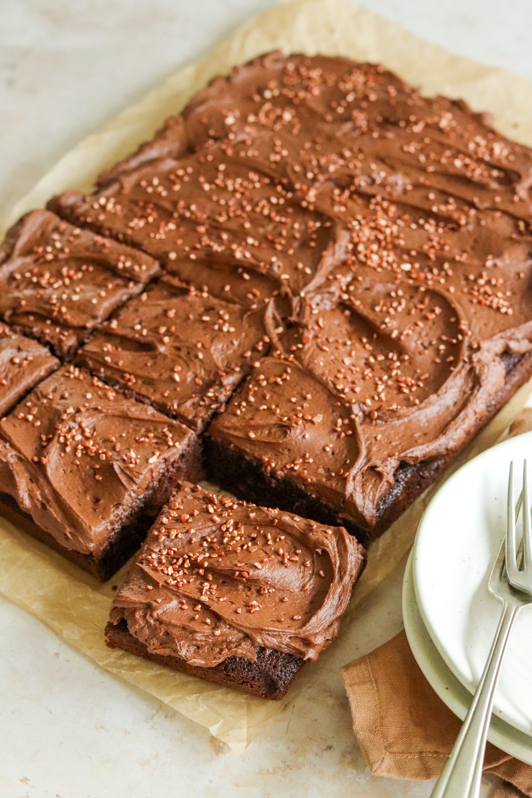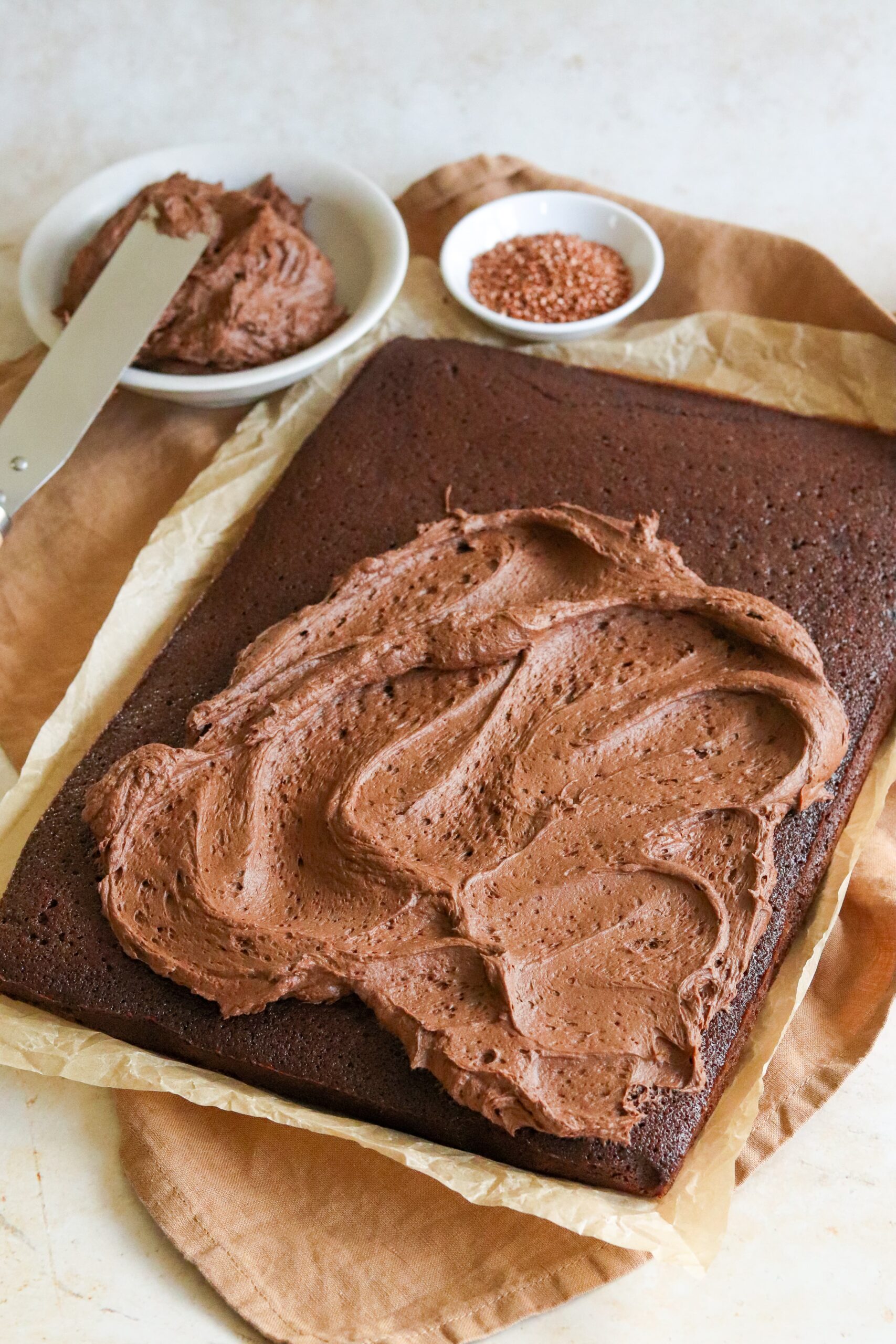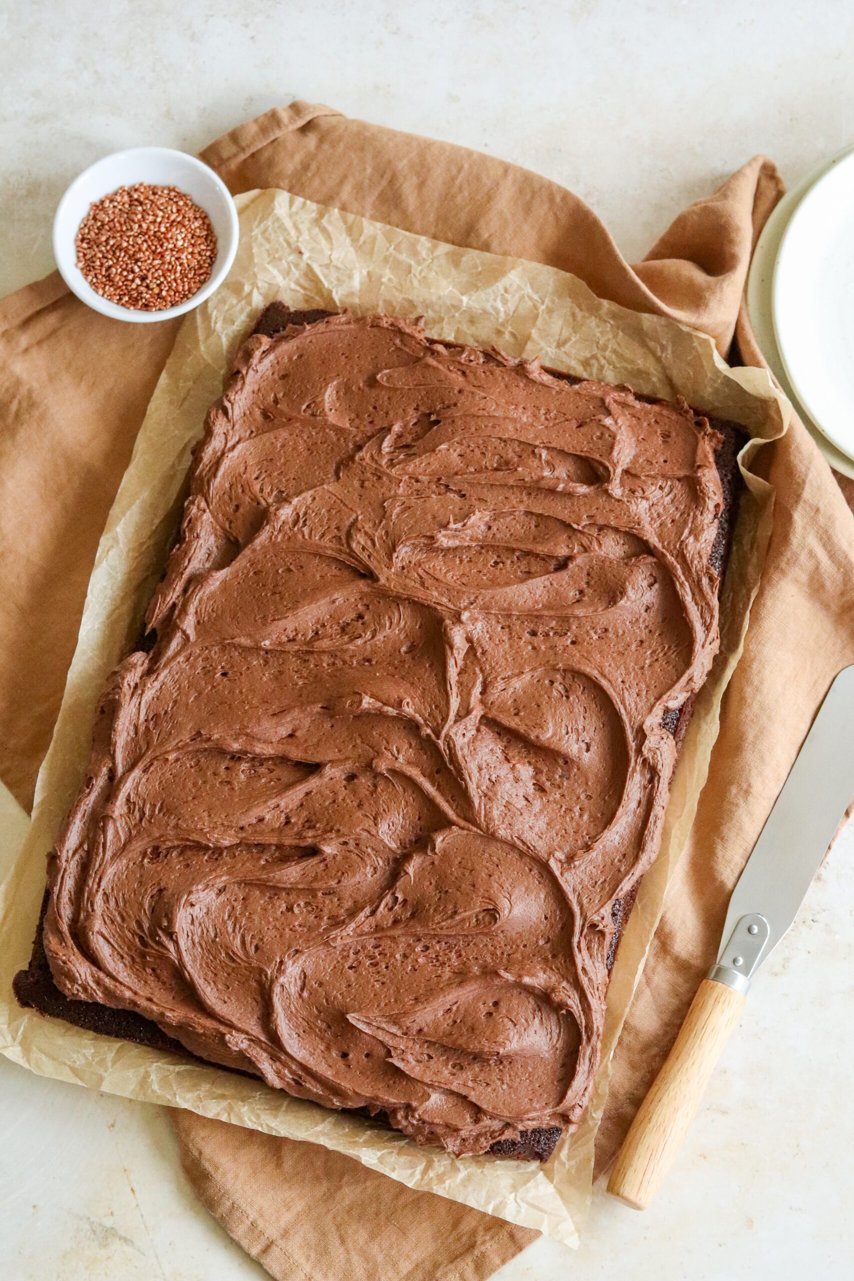 This rich Chocolate Traybake is simple to make and an absolute winner on flavour. It’s light and fluffy texture and deeply chocolatey buttercream are an irresistible combination.
