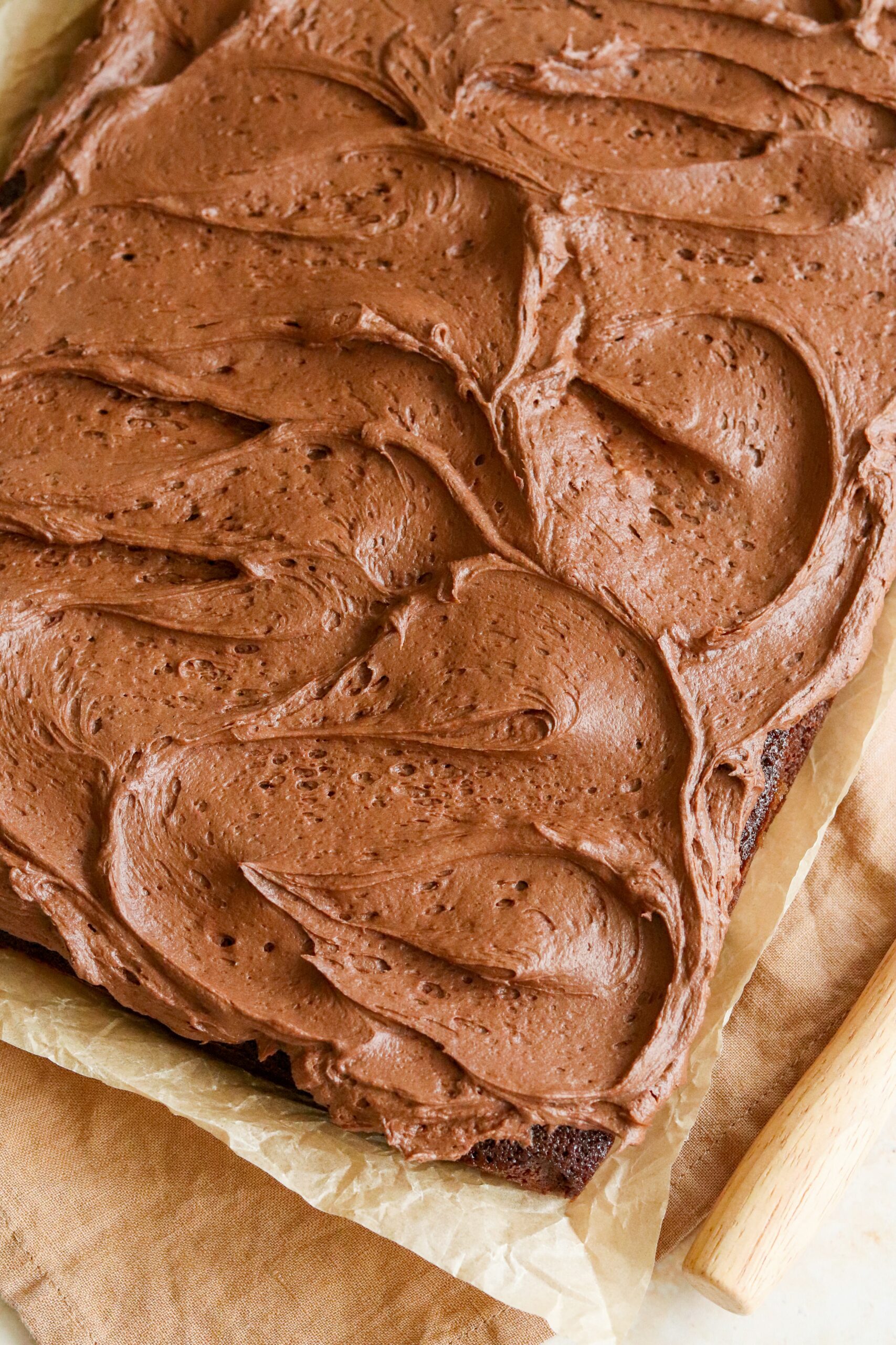 This rich Chocolate Traybake is simple to make and an absolute winner on flavour. It's light and fluffy texture and deeply chocolatey buttercream are an irresistible combination.